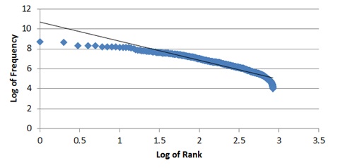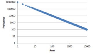 Zipf’s Law is a mathematical rule that states that the frequency of a word’s usage is proportional to power of its rank. The most widely accepted explanation for this phenomenon is the principle of least effort, which basically boils down to: it’s a whole lot easier to remember a smaller set of words than a larger one.