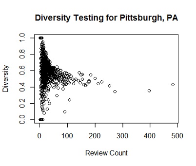 What I eventually began to notice was that each city had a different diversity “fingerprint.” True, every city’s diversity-review-count scatterplot was a single contiguous mass, but each city’s contiguous mass approached a different limit. Further research might account for this difference. Perhaps it is has to do with the total number of neighborhoods in a city, or perhaps it has more to do with the geographical density of a city’s hot spots.